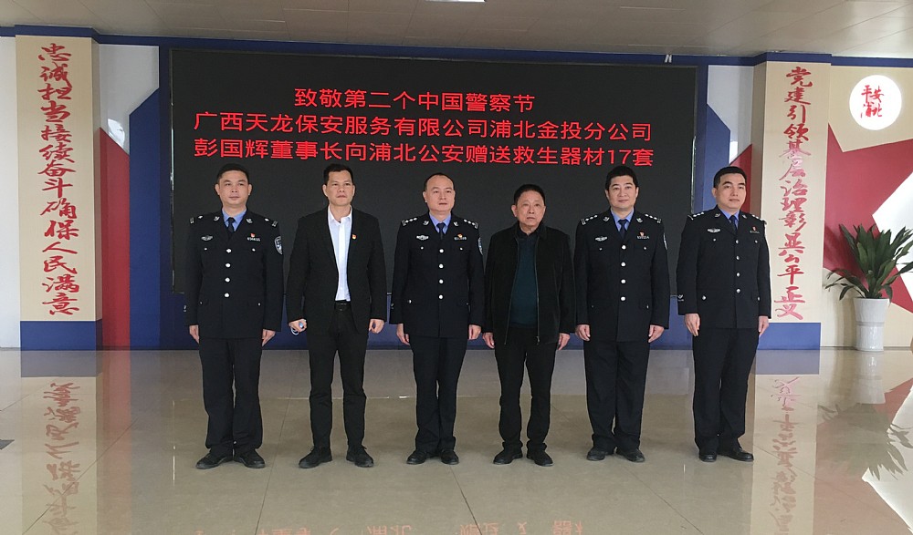 2022年1月7日,在第二個“中國人民警察節”即將到來之際,為表達對人民警察的敬佩之情,海龍集團旗下天龍保安浦北金投分公司向浦北公安捐贈救生器材一批,浦北縣副縣長、公安局局長范明藝、海龍集團董事長彭國輝等領導參加捐贈儀式。
